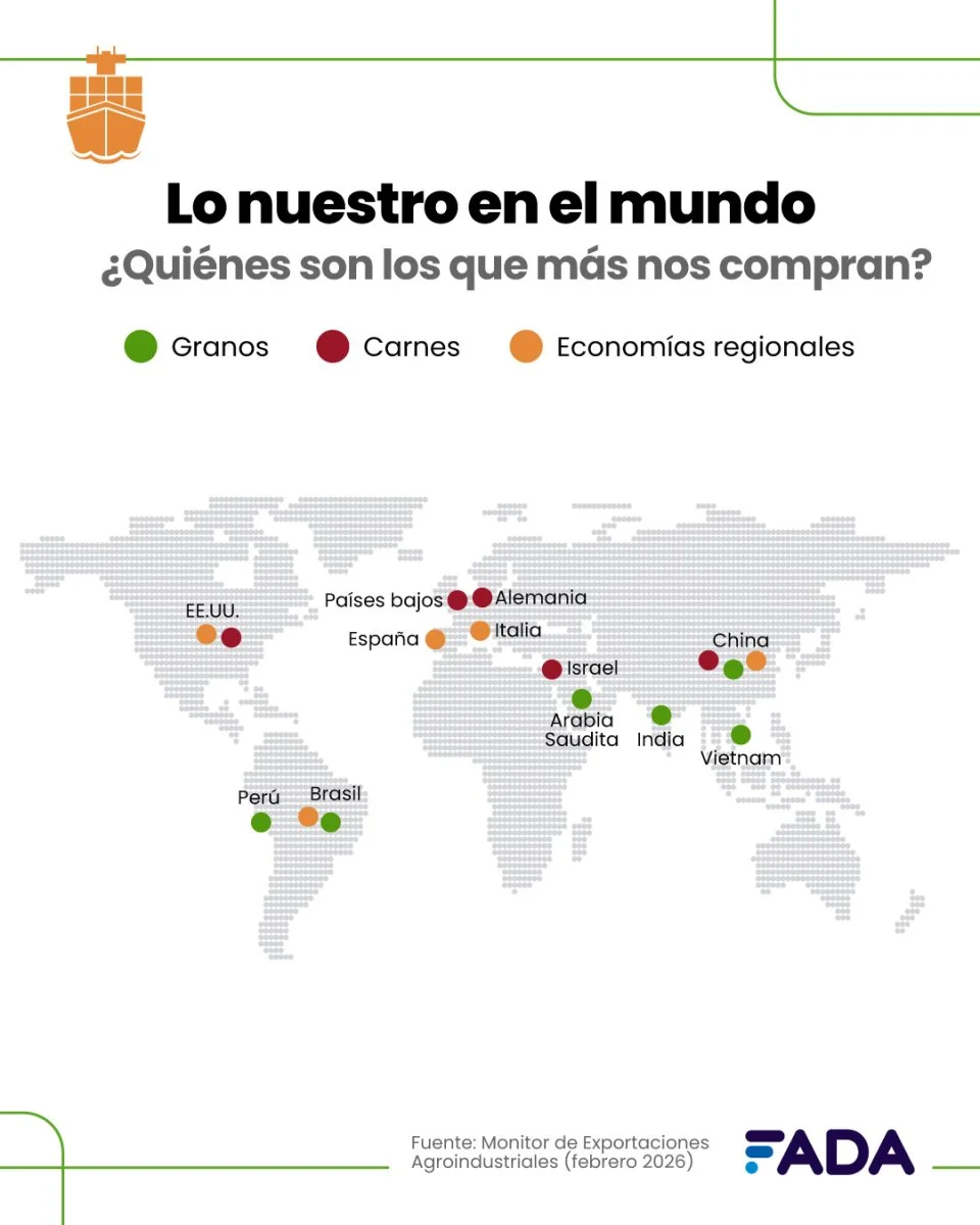 En su informe publicado desde el Monitor de Exportaciones Agroindustriales, FADA (Fundación Agropecuaria para el Desarrollo de Argentina) destacaron que "le vendemos a más de 143 países, es el 75% del mundo. Si analizamos nuestro rol en los mercados globales, vemos que somos los primeros vendedores de maní, aceite de soja y aceite y jugo de limón". Así lo indicó Nicolle Pisani Claro, Economista Jefa FADA, quien agregó: "Estamos segundos con harina de soja y yerba mate y completamos el podio con el maíz. Es un orgullo como argentinos".