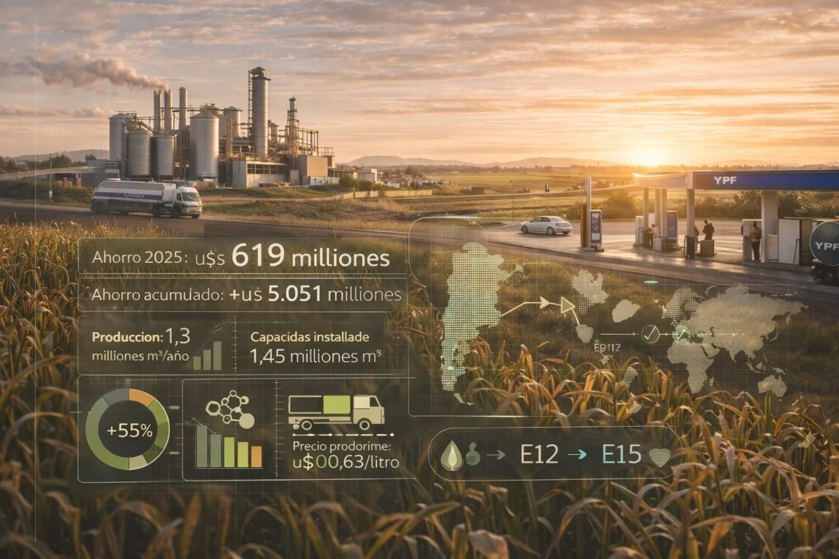 Sin computar diciembre, el bioetanol le permitió al país un ahorro de divisas de u$s619 millones al evitar importaciones de naftas equivalentes a los metros cúbicos entregados para consumo. En los ocho años previos, este beneficio a la balanza comercial del país acumuló u$s5.051,8 millones. Asimismo, gracias al octanaje del bioetanol, las refinadoras de petróleo volvieron a tener en 2025 un sustancial ahorro en su costo de producción: compraron etanol por u$s 755,5 millones, evitando un costo extra de u$s1.236,6 millones si hubiesen utilizado como fuente octánica al Tolueno y de u$s535,8 millones si optaban por sustituirlo por MTBE.
